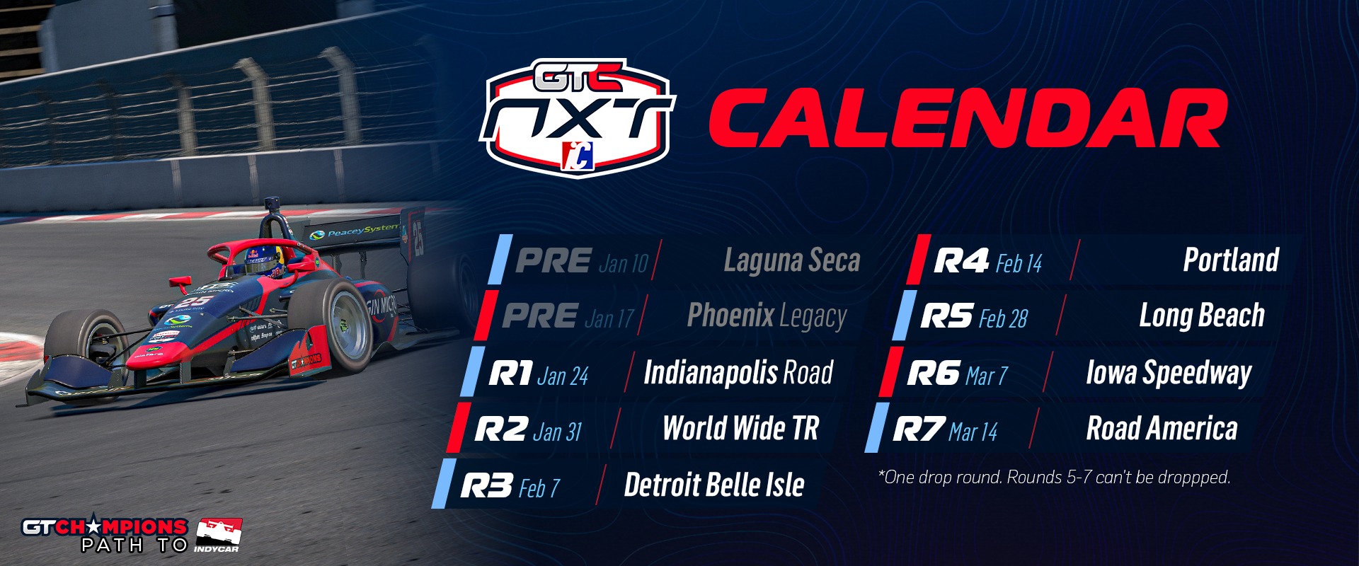 The GTC NXT series is the critical next step in our GTC Path to IndyCar program. This is a high-speed, competitive open-wheel challenge, guaranteed to test your skill in a very fun car on a diverse and exciting mix of road circuits, high-speed ovals, and challenging street courses. If you love high-stakes open-wheel racing and are ready to prove your versatility and pace, the GTC NXT Series is where you make your mark against the best drivers in the community.