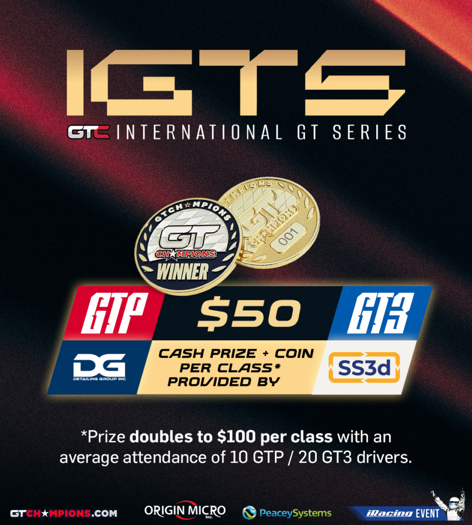 Registration for the IGTS is completely free, and everyone is welcome to join the grid. However, to help us cover the organization’s running expenses and make the new $50* cash prizes and GTC Winner’s Coins possible for both classes, we are suggesting an optional $3 contribution. If you enjoy racing with us and want to help support the series, you can make your contribution using the payment link: PayPal link