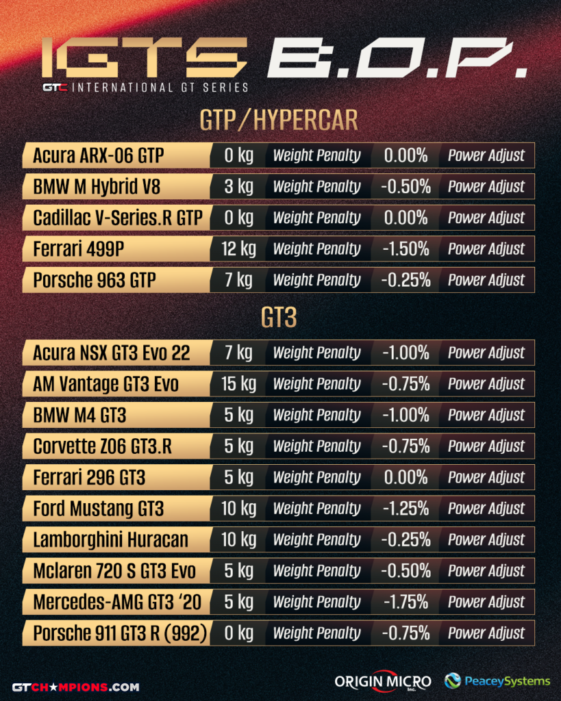 We will be using the latest iRacing Sebring 12hr BoP for both the GTP and GT3 classes. We are only going to apply the Weight and Power adjustments and will not be using the Fuel adjustments, as those are meant for endurance events and do not fit our 70 minute race format. If iRacing updates the cars during our season or releases a new BoP that makes sense for us to use, we will adopt it, but rest assured we will always make an announcement with plenty of advance notice before any changes take effect.
